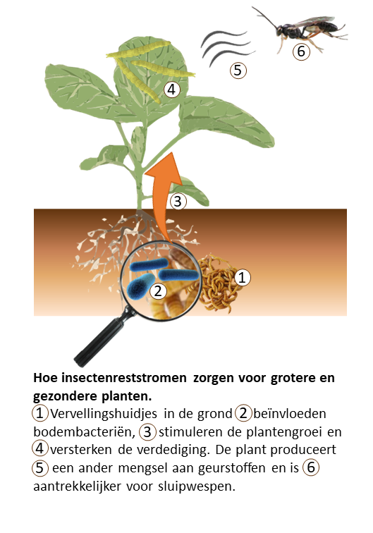 Dus reststromen van de insectenproductie voor voedsel en veevoer kunnen we mengen door de grond voor de opkweek van landbouwgewassen. Daar zorgt het voor meer nuttige bacteriën in de grond en voor grotere gewassen. Ook kunnen de planten zich beter verdedigen tegen insecten én trekken ze meer parasitaire wespen aan. Bovendien houden deze effecten stand in het veld. Het toevoegen van insectenreststromen aan de grond van landbouwgewassen draagt dus niet alleen bij aan de kringlooplandbouw, het kan ook het gebruik van kunstmatige meststoffen en pesticiden verminderen!