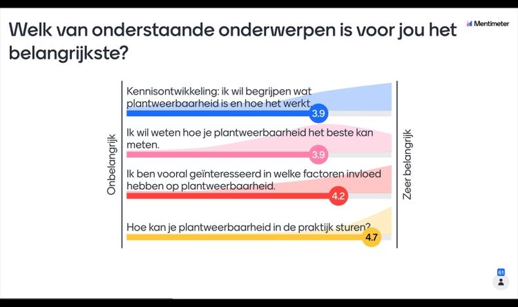 Vervolgens konden de deelnemers via een korte interactieve sessie onder leiding van Frank Hoeberichts aangeven waar zij aan denken bij 'plantweerbaarheid'. Dit leverde een mooie verzameling aan termen op. Ook konden de deelnemers aangeven welke aspecten van plantweerbaarheid voor hen het belangrijkst zijn. Vooral de sturing van plantweerbaarheid in de praktijk blijkt op veel interesse te kunnen rekenen.