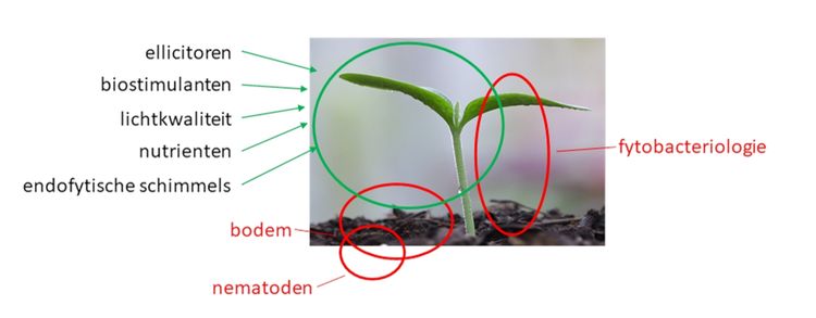 Plantweerbaarheid houdt zich bezig met de onderwerpen in de groene cirkel. Hierbij zijn er uiteraard raakvlakken met andere disciplines, zoals bodemmicrobiologie en fytobacteriologie.