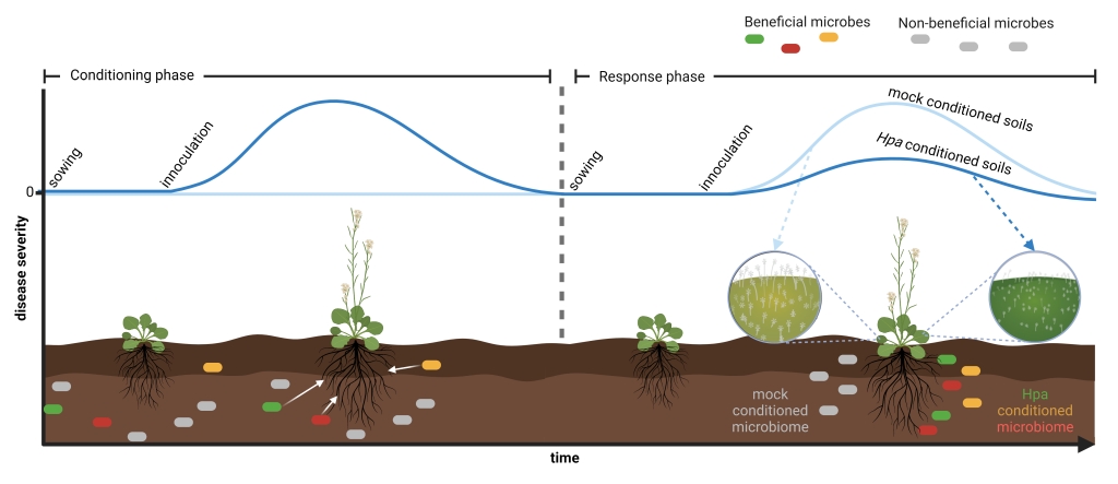 We demonstrated that hormonal plant defense responses are stimulated by soil microbes that become more abundant around the roots. Mutant plants that are unable to produce specific metabolites in the roots lack this microbial shift and consequently the ability to create a disease suppressive soil. This shows that the plant is actively communicating with beneficial microbes in the soil to vaccinate itself and its descendants against disease.
