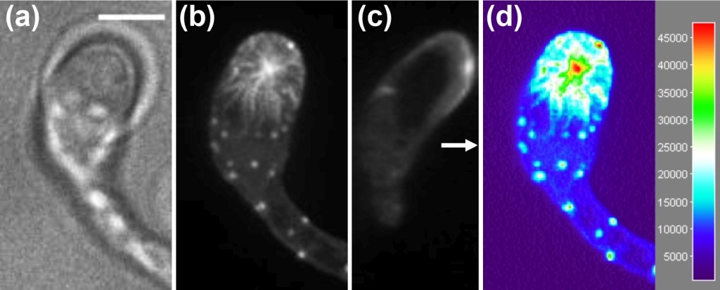 Een invasieve kiembuis van Phytophthora infestans met een stervormige actine aster. (a) helder veld afbeelding, (b) actine gelabeld met Lifeact-eGFP, (c) rotatie van (b) waarbij het dekglas met een pijl wordt aangegeven en (d) de intensiteit van de fluorescentie van (b). Uit ‘Kots K, Meijer HJG, Bouwmeester K, Govers F, Ketelaar T (2017). “Filamentous actin accumulates during plant cell penetration and cell wall plug formation in Phytophthora infestans.” Cellular and Molecular Life Sciences 74(5): 909-920.’