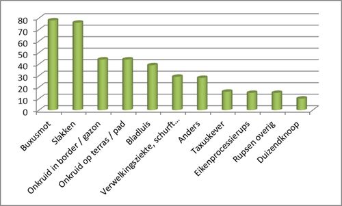 De voornaamste veroorzaker van overlast en schade in tuinen was het afgelopen jaar de buxusmot. Bij een inventarisatie onder KNPV-leden noemde 36% van de respondenten de mot. Onkruid (zoals zevenblad, gras, mos en Japanse duizendknoop) werd met circa 19% even vaak genoemd als insecten (zoals luizen, taxuskever, eikenprocessierups en spint). Schimmels ‘scoorden’ 14%. Deze problemen zullen steeds meer overlast veroorzaken, verwacht een meerderheid van de respondenten. Een kleiner deel verwacht nauwelijks tot geen veranderingen, hooguit meer fluctuatie in welke ziekte of plaag in een bepaald jaar de boventoon voert. Weersomstandigheden spelen daarbij een voorname rol. Zoals de afgelopen hete en droge zomer schimmels minder voorkwamen. Bekijk de uitgebreide presentatie hier.